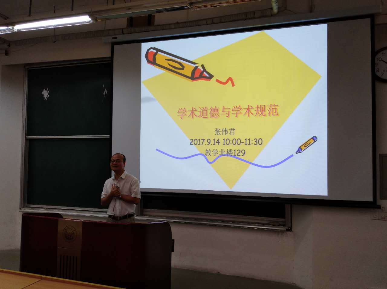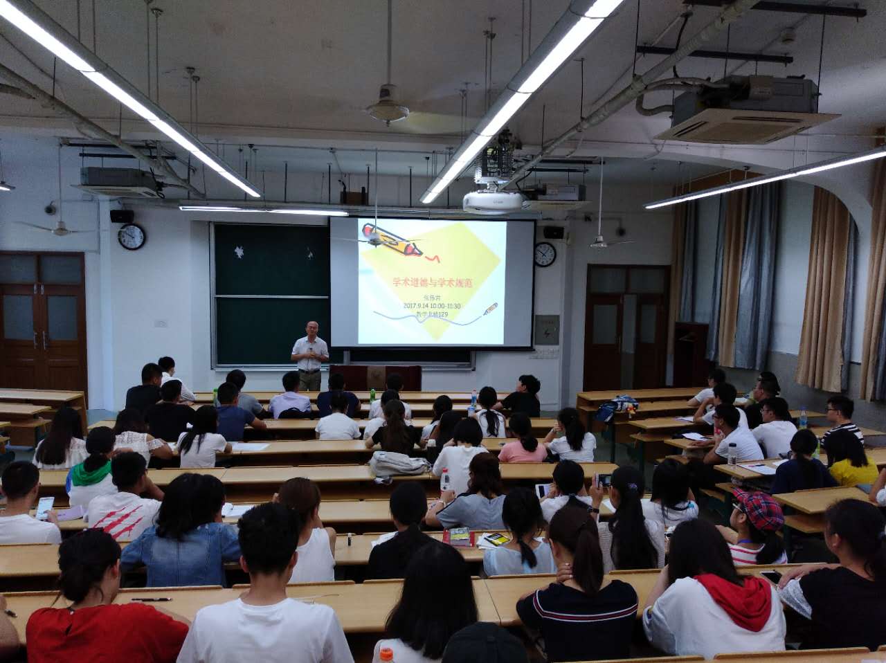 2017年9月14日上午,作为yl9193永利2017年“立德树人”新生入学教育周的主题教育活动之一,“学术道德与学术规范”主题教育在教学北楼129室举行。yl9193永利张伟君教授为2017级全体本科生和研究生新生作主题报告。公司党委副书记、纪委书记杨秋华主持报告会。