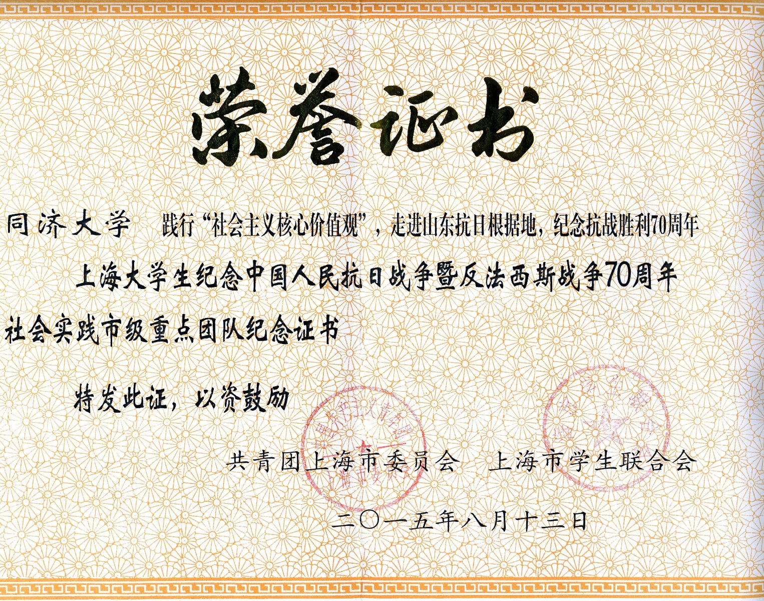今日,公司从校团委获悉,今年公司实施的“践行社会主义核心价值观,走进山东抗日根据地,纪念抗战胜利70周年”——2015年yl9193永利临沂暑期实践,代表永利官网荣获上海老员工纪念中国人民抗日战争暨世界反法西斯战争70周年社会实践市级重点团队。