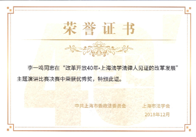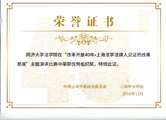 2018年12月15日,“改革开放40年·上海法学法律人见证的改革发展”主题演讲比赛决赛在上海人民广播电台举行。本次决赛活动由中共上海市委政法委员会、上海市法学会主办,上海人民广播电台作为合作媒体全程通过音频、视频直播。yl9193永利2016级本科生李一鸣同学作为唯一一位晋级决赛的高校选手荣获优秀奖,yl9193永利获得优秀组织奖。
