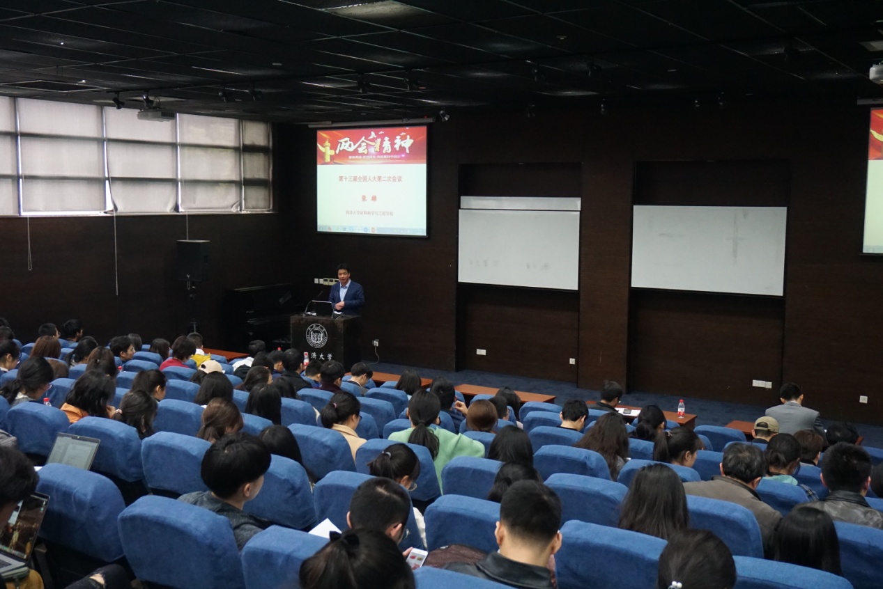吴为民在主持会议时指出,学习贯彻全国“两会”精神是现阶段全院师生的重要任务。学习贯彻“两会”精神,首要的是提高思想认识和政治站位,树牢“四个意识”,坚定“四个自信”,做到“两个维护”,进一步增强不忘初心、牢记使命,同心砥砺、继续前行的信心和决心。“两会”期间,习近平总书记六下代表团参加讨论,并围绕坚定文化自信、生态文明建设、脱贫攻坚、乡村振兴、创新创业创造、落实军队建设“十三五”规划等问题发表了一系列重要讲话,是习近平新时代中国特色社会主义思想的具体化,进一步明确了方向、提供了根本遵循。吴为民最后表示,2019年是非常特殊的一年,也是学院学科谋发展、上台阶的关键一年,我们要把学习贯彻“两会”精神落实到日常的工作学习当中,以更加饱满的精神,勤奋工作,刻苦学习,创造更优异的成绩,迎接和庆祝新中国成立70周年。