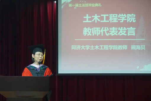 土木工程学院教师代表熊海贝以“珍惜”为主题为毕业生送上寄语。她希望同学们珍惜时间,珍惜缘分,珍惜挫折,珍惜成功;特别要珍惜自己拥有的力量:土木四年让同学们拥有了建屋架桥,修隧通路的本领,法学四年让同学们学会了断事明理,建章立规的理论,双重的力量也带来双重的责任,希望同学们在今后的岗位中充分运用自己跨学科的知识与能力,自信、自律,建设美好中国。