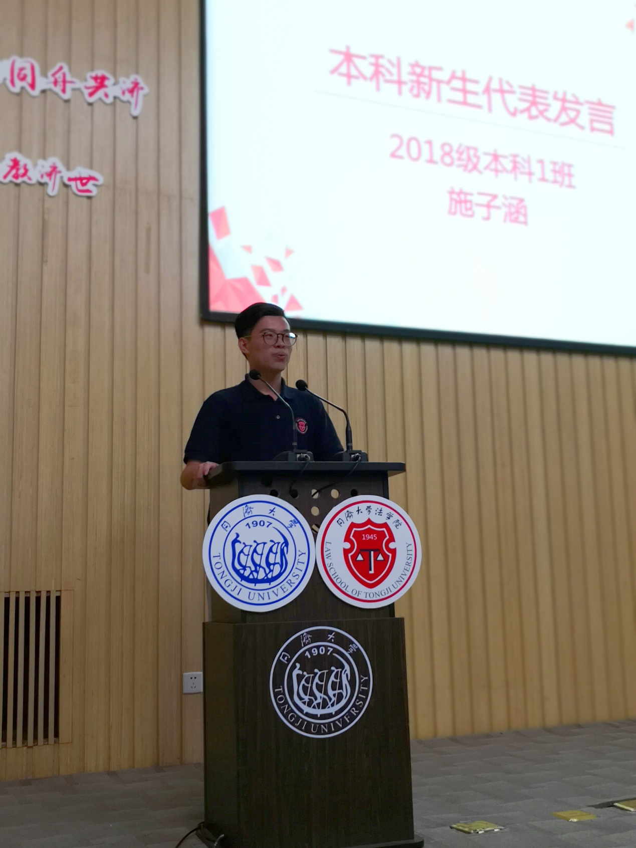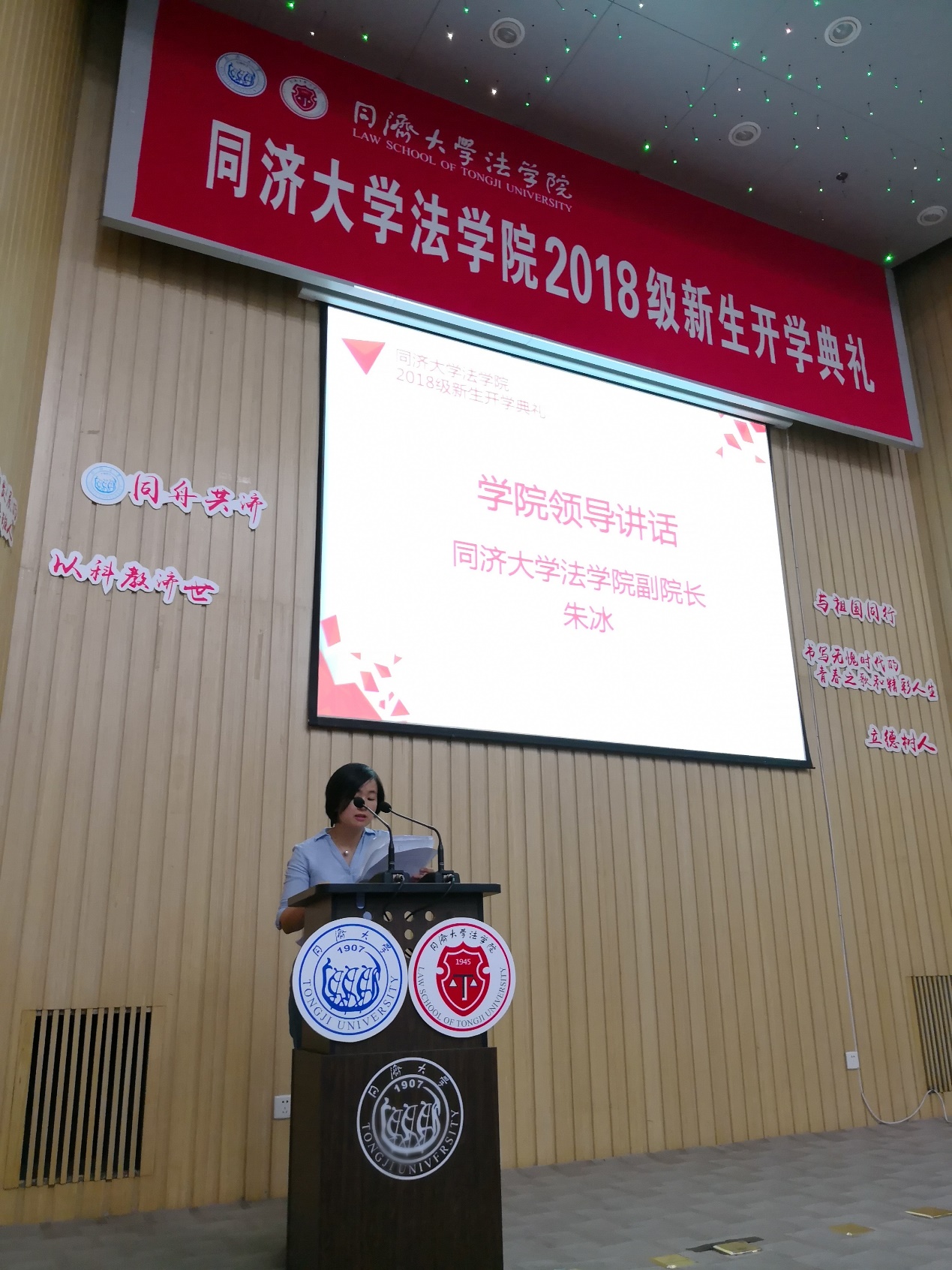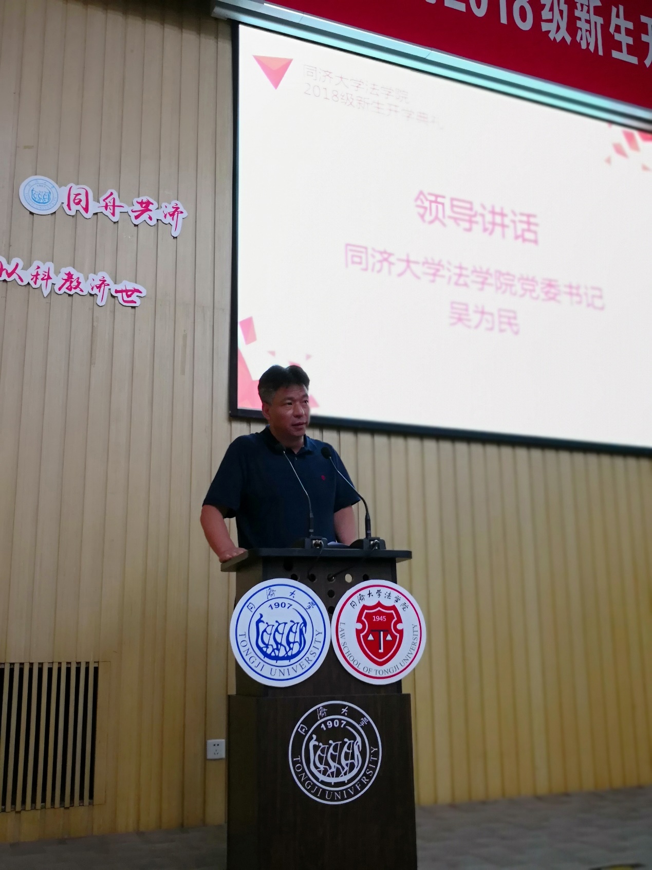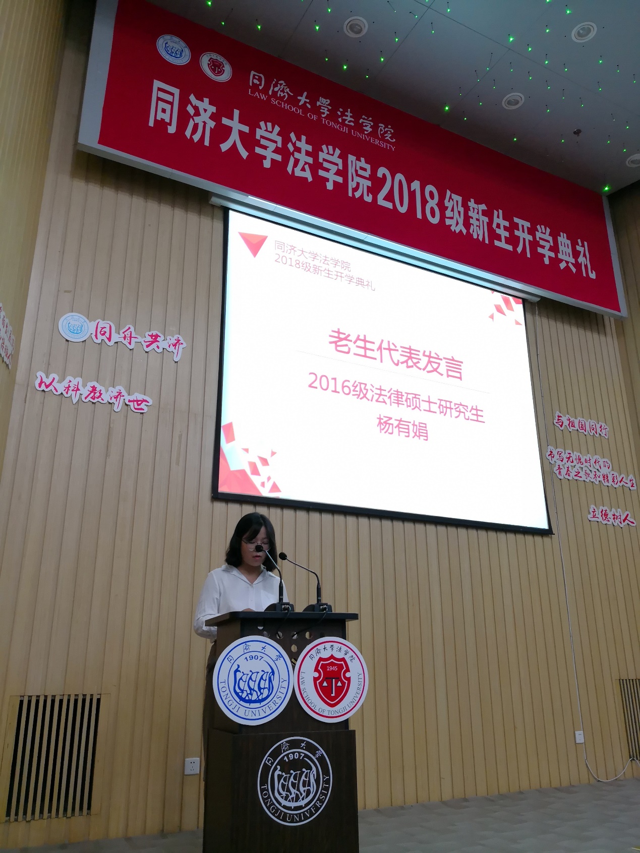 2016级法学硕士研究生、永利官网2017-2018年度优秀员工党员杨有娟作为老生代表发言,分享了在同济学习两年来的真切感悟,激励新生站在新的人生起跑线上,以务实的态度在同济继续好好学习、拼搏奋斗。2018级本科生施子涵、2018级法学硕士研究生刘宣廷分别作为本科生和研究生新生代表发言,表达了法学学子对未来在同济生活的共同期盼与憧憬。