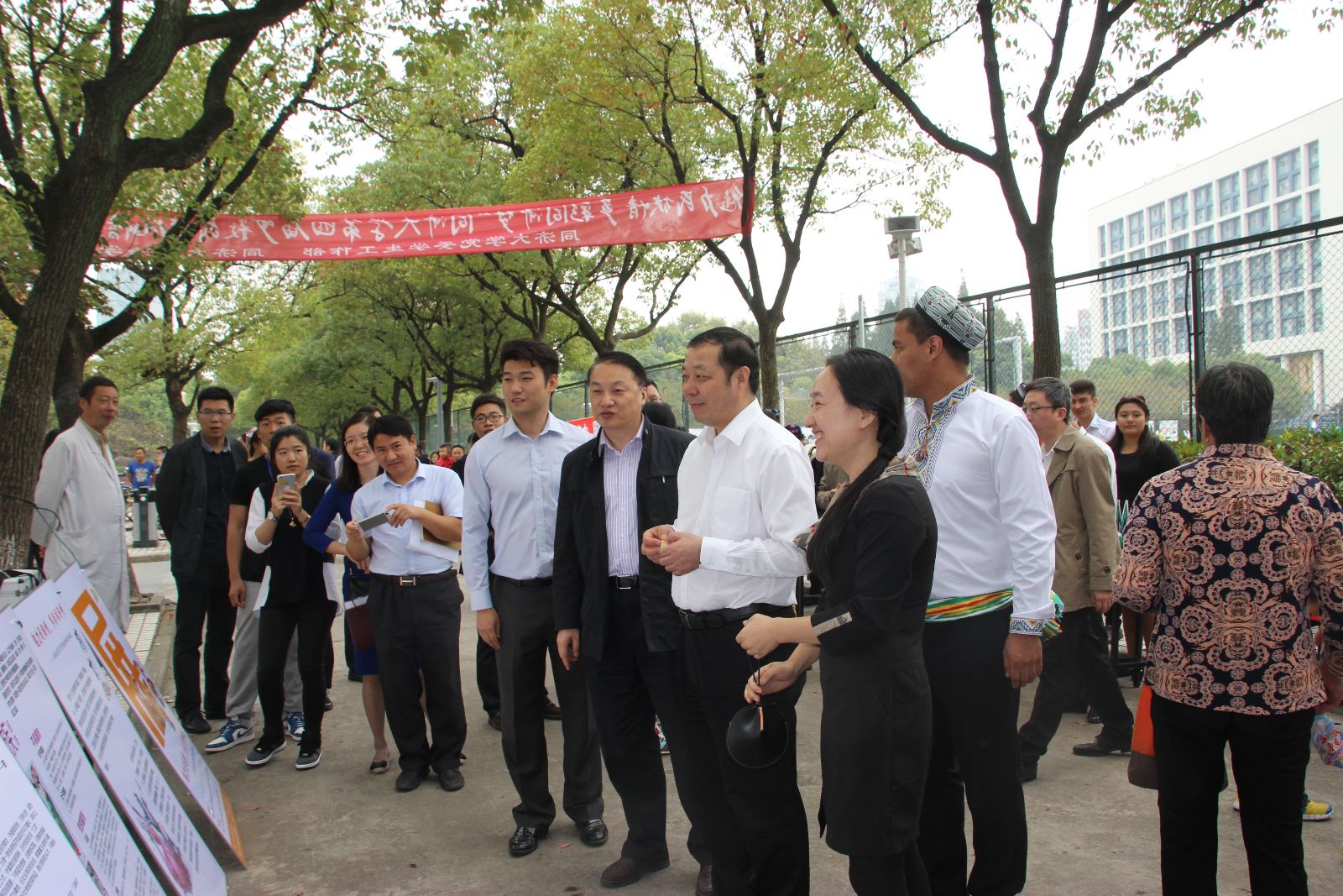 活动现场气氛热烈,藏族同学向各位老师献上一条条洁白的哈达,维吾尔族同学向老师们递上民族特色的食品馕、干果、手抓饭等食物,在各民族文化展板前,同学们热情的向老师们讲述着自己家乡的地理特征、风俗习惯,一一解答师生们提出的各种问题。杨贤金、徐建平兴致勃勃地戴上维吾尔族同学送的花帽,品尝藏族特色的食物以及青稞酒、酥油茶,参观藏族帐篷,观看民族舞蹈并与同学们一起跳舞联欢。杨贤金在各展台前仔细询问各少数民族特色物品的名称和用途,赞美少数民族地区的靓丽风景和特色文化,鼓励同学们努力学习,将来建设更加美好的家乡。