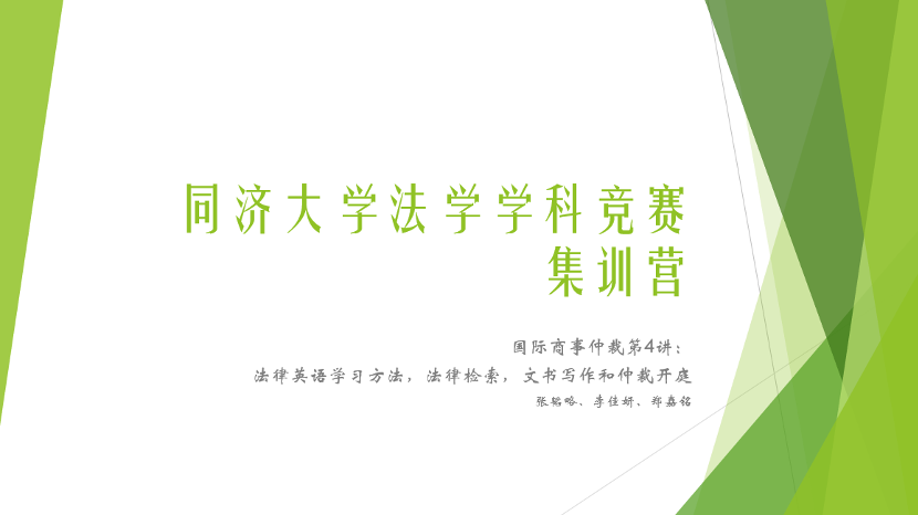 4月上旬,我加入了期待已久的同济法学学科竞赛集训营。其中,我尤为关注‘国际商事仲裁’板块,通过前后四次讲座,我了解了Vis Moot国际商事仲裁的比赛概况和规则。讲座中对于法律检索和法律英语的讲授更是给了我一把开启法律学习的钥匙,让我在日后能够长久地从中获益。集训结束后,我报名参加了考核,在准备的过程中,在集训营获得的资料对我产生了极大的帮助。最后我通过考核有幸成为了Vis Moot竞赛队中的一员,我获得的不仅是队员资格,还是一段可以挑战自我、和大家共同进步的时光。