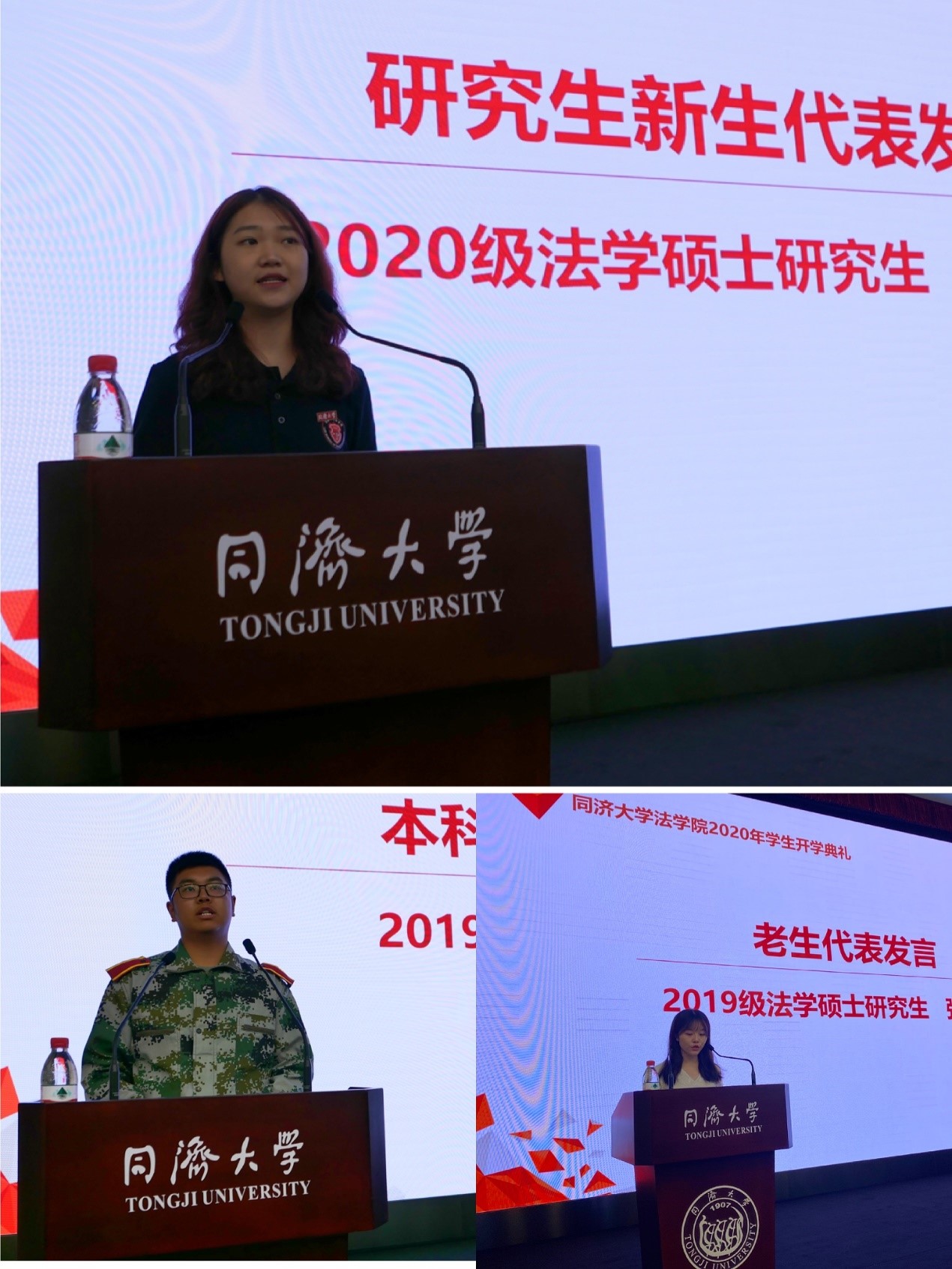 2019级法学硕士研究生张钟月作为老生代表发言。她首先感谢学校和学院为法律学子创造的良好学习、实践、交流的平台,并寄语学弟学妹们要:坚定理想信念,初心不改,使命不忘;锤炼各项本领,学无止境,勤于思考;积极投身实践,脚踏实地,仰望星空。陈宇佳、郭鑫祥,分别作为2020级研究生新生代表、2019级本科生代表发言,他们表达了作为一名新的“同济法律人”的欣喜和激动之情,并对即将开始的新的学习旅程表示期待与憧憬。