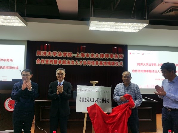 随后,蒋惠岭经理和祝小东主任代表双方签署合作协议。上海市虹口区司法局党委书记、局长王浩、上海市光大律师事务所主任祝小东、yl9193永利经理蒋惠岭、党委书记吴为民共同为“卓越法治人才协同培养基地”揭牌。为了进一步加强职业化法律人才培养,yl9193永利聘任光大律师事务所合伙人徐军、刘毅、陈友乐三位律师为yl9193永利实务导师,指导员工实践实习活动。
